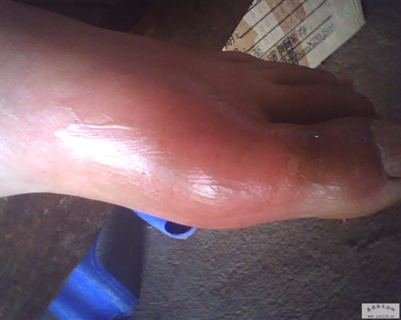 这个病人脚趾上不明原因引起的红肿疼痛,请各位同行帮忙看看。如图: