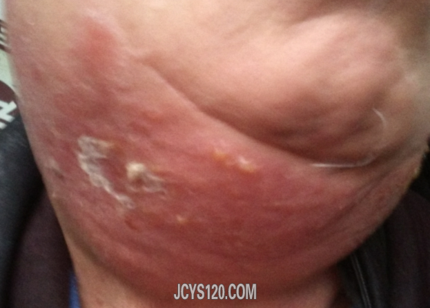 男,67岁,几天前牙痛,去别家烧,贴膏药等治疗,牙痛稍好,但是下颌周围如图,12日早来诊。