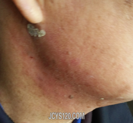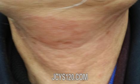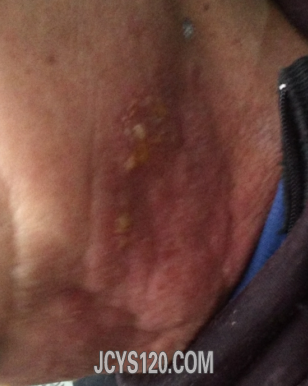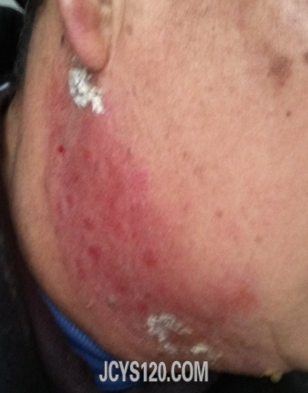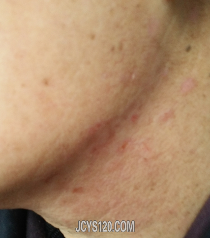 治疗前: 主要症状:右耳后至左耳前,沿下颌一圈,局部红癍,肿胀,皮肤发热,并伴较重的疼痛,皮损区有丘疹,伴有渗液,全身不定处偶有痒感,偶处可见小颗粒的丘疹。 治疗一天后:
