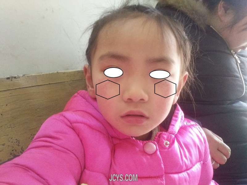 4岁 发热, 咳嗽2天,T 38.5,面部发现有斑点样皮疹其余(—);用药不详。