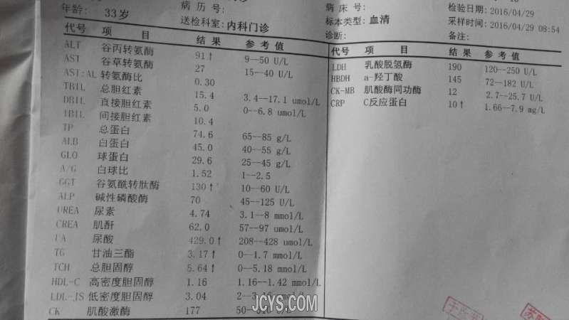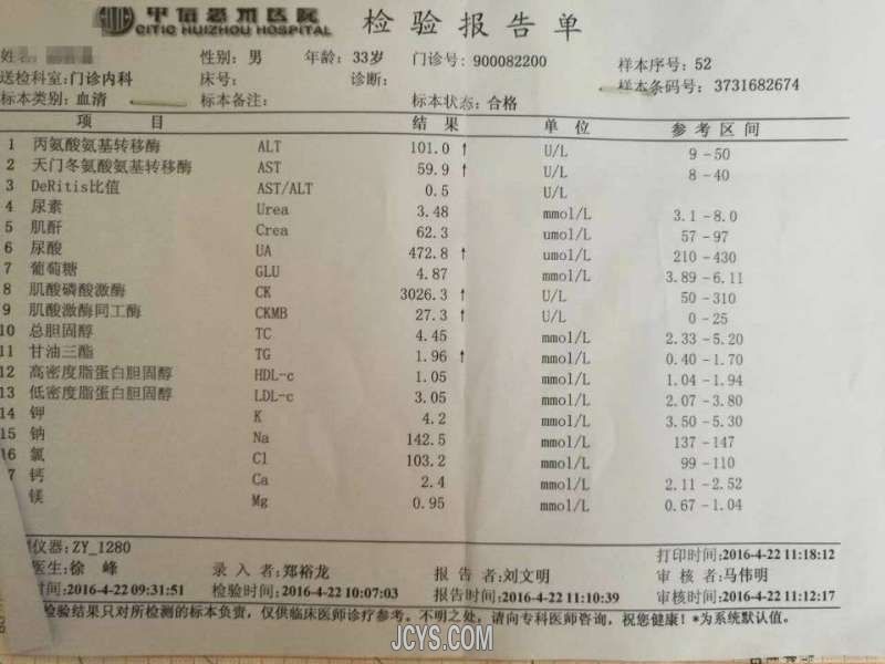 前言:这是一张由化验单整理的一个病例,也是因为前些日子的一点小感慨而想发个帖子,正巧有这么个病历,患者是我的一个亲戚,前天中午微信接到远在广东惠州他的留言,咨询我肌酸磷酸肌酶3026.3U/L,正常值上限310U/L,是什么问题?当时他把“肌酶”打成了“氨酶”,我让他确认一下有没有打错字,看一下化验单对应的英文缩写到底是CK,还是CK-MB?后得到传过来的化验单是CK值,那么问题来了,如果大家只收集到这样一个信息,你该怎样去围绕这个化验单去问诊?怎样去做初步的诊断?怎样去处理?我大致整理成了一个病历,因为在网上简单问的,所以有些病史和临床表现可能采集的不是很完整或者说不正确,不过感兴趣的可以先看一下,因为在日常的诊疗中,各位医生朋友或多或少都接触过患者拿化验单咨询我们有没有问题,是哪些方面的问题,也有些时候是因为我们接诊患者,建议其到医院做哪些检查,我们拿到检查而做的参考等等。另外一件事,大约一个月前,那天我休息,我的一个大哥因右下腹疼痛1天找到我,经查体后,麦氏点压痛(++),反跳痛(+),无肌紧张,我初步诊断为“阑尾炎”后让其去查血常规和彩超,就在结果出来后,接到嫂子电话,外科门诊主任诊断阑尾炎,要求住院手术,我询问白细胞和中性粒是多少,彩超结果,后来嫂子也没有说明白,经他家考虑先保守治疗,辗转到一个诊所,我电话交待把检查结果给诊所医生看,这个单子很常见,每个医生都会看,另我意想不到的是,诊所医生看血常规后直接说血常规没有事,血象正常。下午输完液后我拿到血常规,看到白细胞正常,中性86.5%,直接告诉嫂子不能只看这一项正常就没事了,我们主要还要看中性粒的,现在从临床表现及血常规提示感染还是比较重的,我建议手术治疗,保守治疗就算好转也会反复发作,家人考虑正在服用抗结核药,身体较弱,还是想先保守,我只能告诉密切观察病情,只要症状加重,一定要手术,第二天,腹痛加重,还是手术了。一个最常见的血常规化验单,我不理解为什么做为医生不会看,后经侧面了解,那个医生没有经过正规的专业学习。做为一名医生不要求所有的化验都懂得,但最起码三大常规,常见的生化检查等等还是要会看,最起码要有一个大致的了解,我无意于要贬低诊所的医生,但是,这样的解释会耽误患者病情,以至会影响整个治疗方案甚至是预后。说一下CK值增高的这个病历: