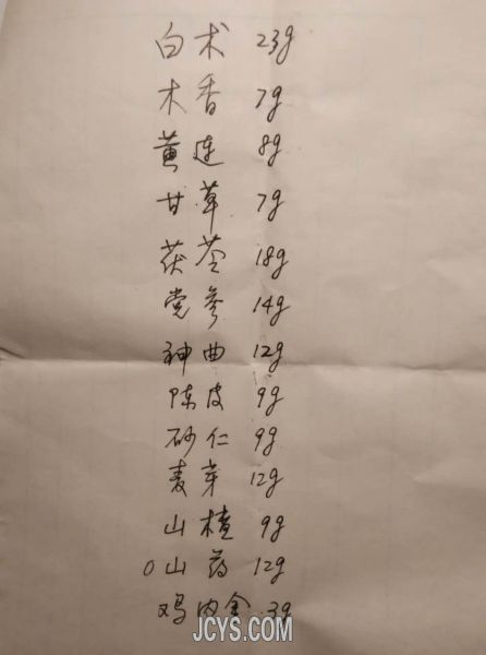 白术 23 木香 7 黄连 8 甘草 7 茯苓 18 党参 14 神曲 12 陈皮 9 砂仁 9 麦芽 12 山楂 9 山药 12 鸡内金 3
