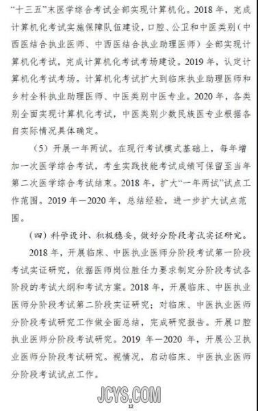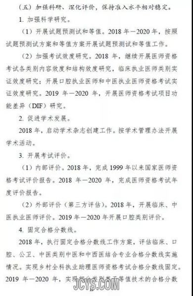 2018年,开展临床、中医执业医师分阶段考试第一阶段考试实证研究,依据医师岗位胜任力要求制定分阶段考试各阶段的考试大纲和考试方案。2018年,开展临床、中医执业医师分阶段考试第二阶段实证研究;对临床、中医执业医师分阶段考试研究工作做全面总结,完成研究报告。开展口腔执业医师分阶段考试研究。2019年-2020年,开展公卫执业医师分阶段考试研究。视情况,启动临床、中医执业医师分阶段考试试点工作。