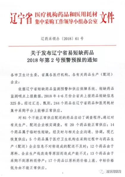 2018年7月23日,辽宁省药品和医用耗材集中采购网发布了一则预警通知, 12个药品由于原料、企业生产线改造等原因而造成产能不足; 13个药品由于采购不到原料而停产; 17个药品以原料药价格上涨、中标价格低为由不能正常供应。