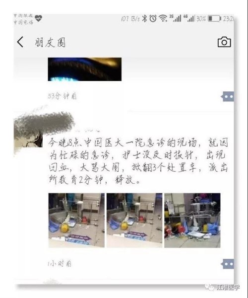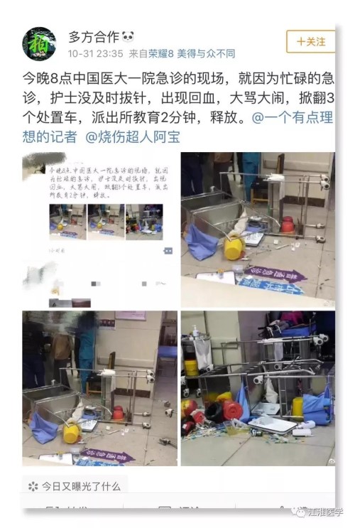 就在此案发生不久,据@多方合作消息,10月31日晚8点,中国医大一院急诊科,因为忙碌的急诊,护士没及时拔针,出现回血,被患者大骂大闹,掀翻3个处置车。然而,如此破坏医疗秩序,辱骂医务人员的行为,最终结果却是派出所教育2分钟,释放。