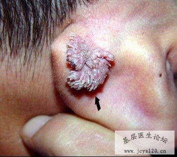 1.寻常疣(verruca vulgaris) 寻常疣俗称“刺瘊”、“瘊子”。皮损初为帽针头大小的皮色丘疹,逐渐增大到豌豆或更大,呈圆形或多角形,界限清楚,突出皮面,表面粗糙不平,呈灰色或淡黄色、黄褐色,触之坚硬。发生在甲周或甲下者,可使指甲、甲床破坏,分别称甲周疣或甲下疣;发生在颈部、眼睑、额部,皮损呈细丝状,顶端角化者称为丝状疣;发生于头皮、趾间,皮损为指状突起,称为指状疣。 组织病理 表皮角化过度,棘层肥厚,呈乳头瘤样增生,颗粒层及棘层上部可见空泡细胞,表皮突延长,在疣周围的表皮突向中心弯曲呈抱球状。