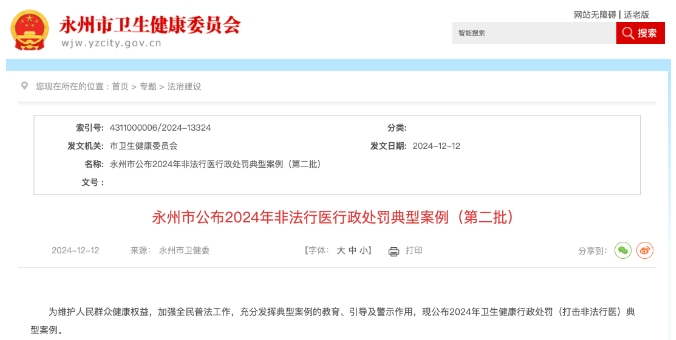 永州市卫健委发布了一条非法行医处罚通知:《永州市公布 2024 年非法行医行政处罚典型案例(第二批)》。