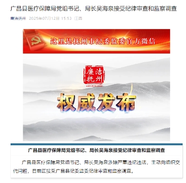 2025年7月12日,江西省抚州市广昌县纪委监委通报:广昌县医疗保障局党组书记、局长吴海泉涉嫌严重违纪违法,主动向组织交代问题,目前正接受广昌县纪委监委纪律审查和监察调查。