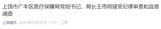 6月29日,据江西省上饶市纪委监委官微“上饶清风”,上饶市广丰区医疗保障局党组书记、局长王传师涉嫌严重违纪违法,主动投案,目前正接受上饶市广丰区纪委监委纪律审查和监察调查。