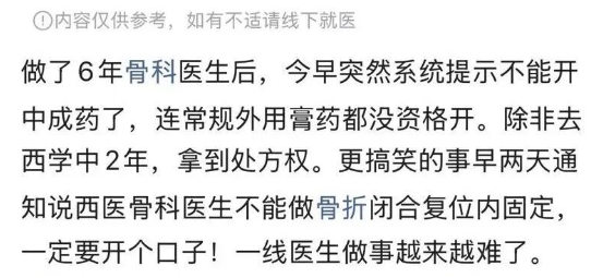 8月25日,某医院骨三科一名医生反馈称:“我做了6年的骨科医生,今早突然系统提示不能开中成药了,连常规外用膏药都没资格开。想开中成药处方,必须去西学中培训2年,拿到处方权。此外早两天医院就通知,说西医骨科医生不能做骨折闭合复位内固定,一定要开个口子……”
