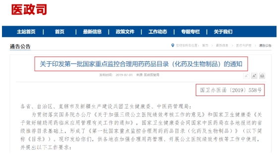 但在2019年,国家卫健委下发了《关于印发第一批国家重点监控合理用药药品目录(化药及生物制品)的通知》【国卫办医函〔2019〕558号】,改变了这种现状。