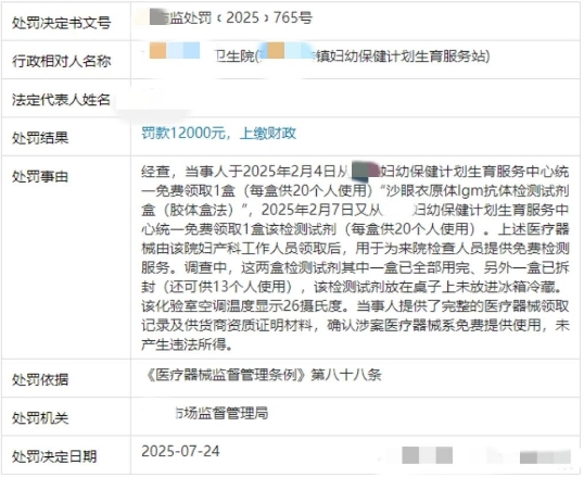 近日,某县市场监督管理局对辖区内一家卫生院作出处罚。经查,当事人于2025年2月4日从县妇幼保健计划生育服务中心统一免费领取1盒(每盒供20个人使用)“沙眼衣原体lgM抗体检测试剂盒(胶体金法)”,2025年2月7日又从县妇幼保健计划生育服务中心统一免费领取1盒该检测试剂(每盒供20个人使用)。