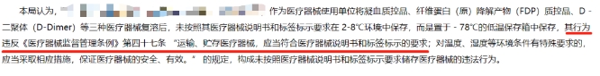 无独有偶,某市市场监管局执法人员在当地某三甲医院检验科,发现 - 78℃低温保存箱内有 46 份已复溶的三种医疗器械质控品。这三种质控品按说明书应在 2~8℃储存,复溶后有效期分别为 4 小时和 24 小时(避光),但医院未按要求保存,此行为违反相关条例,构成未按规定储存医疗器械的违法事实。经综合调查作出处罚,该医院被罚款 23000 元。