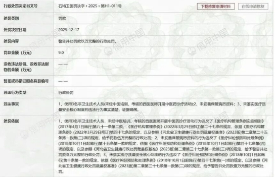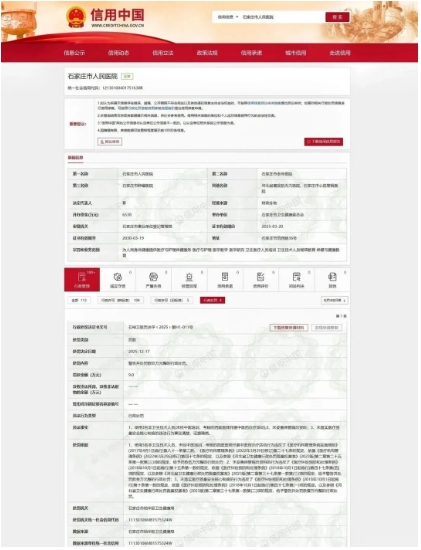 2025年12月17日,“信用中国”官方网站公布的一则行政处罚显示,石家庄市人民医院因三项违规行为被罚:使用未经中医培训考核的西医开展中医药诊疗、未妥善保管病历资料、未落实医疗质量安全核心制度。其中,“西医开中药”的违规行为被罚款5万元,占了总罚金的一半以上。