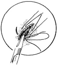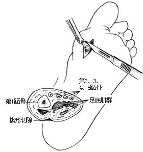 沿鸡眼两侧作梭形皮肤切口,切至皮下后,用组织钳将皮瓣提起,可见鸡眼呈黄白色圆锥状,质坚硬,与周围组织分界明显。沿鸡眼周围钝性分离直至根部,如近根部断裂,可用刀尖剔出,不可残留,以免再发。出血点勿需结扎,缝合切口即可出血。用大弯三角针缝合切口[图1]。