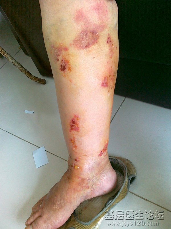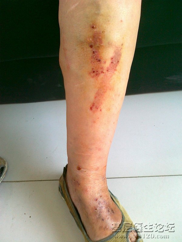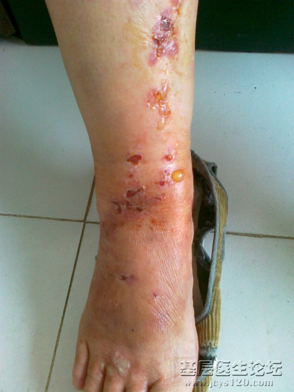 患者,女,70岁,脚癣病史多年,每年夏季严重(此图片是去年7月份拍照,一直没有时间上传此病例),近日无明显诱因出现双下肢水疱,伴有瘙痒、轻度疼痛。