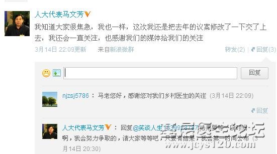 马文芳两会后新浪微博解答乡村医生提问