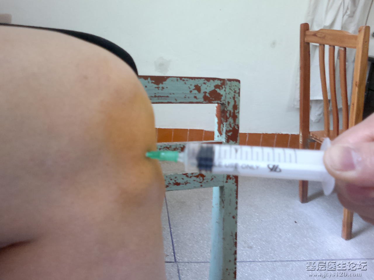 常规消毒,用10ml针筒进行穿刺,回抽,该患者有少许关节液抽出,不过手机拍影,可能不太清楚。