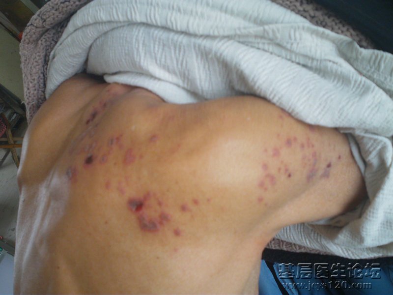 有点象带状疱疹,可能农村患者,自己用了其他方法,加上有痛就又服了安乃近,所以症状轻点,不一定就治愈了。