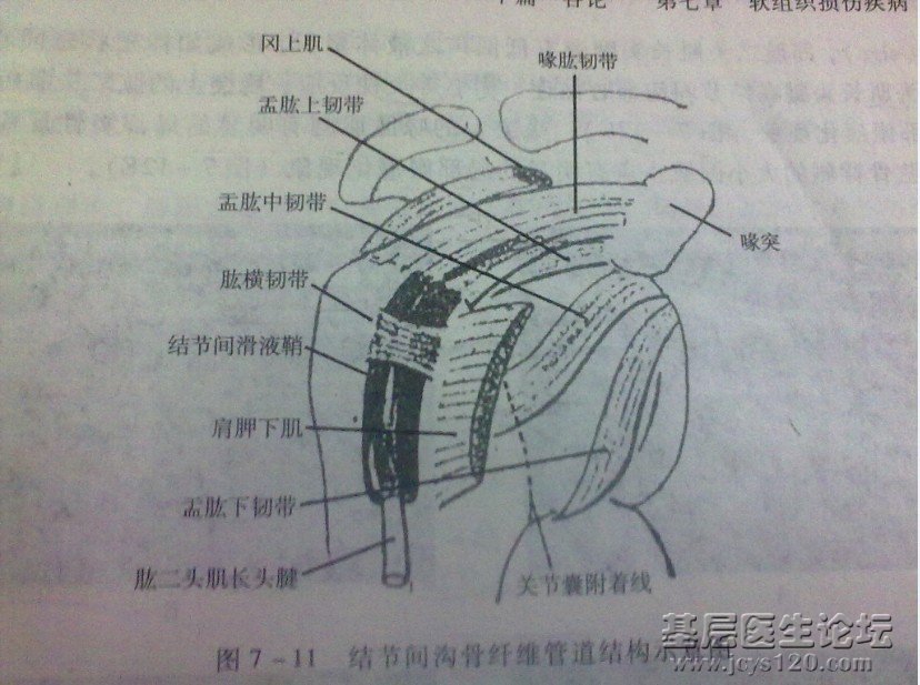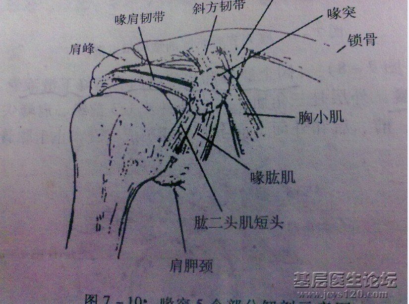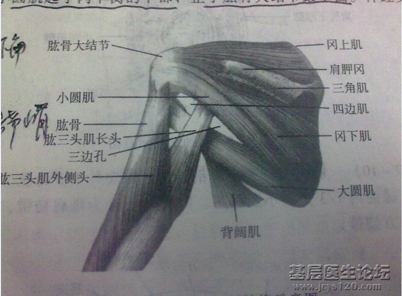 一:肩周炎 临床上最常见的一个病。 局部解剖: 1: 肱二头肌 长头起于肩胛骨的盂上结节,通过肩关节囊,经肱骨结节间沟。短头起于肩胛骨喙突,两头在下部合成一个肌腹,共同止于桡骨粗隆。 2:肩胛下肌 起于肩胛下窝,止于肱骨小结节。 3:冈上肌 起于冈上窝,止于肱骨大结节最上面。 4:冈下肌 起于冈下窝,止于肱骨大结节中部。 5:小圆骨 起于冈下窝下部,止于肱骨大结节最下面。 6:大圆肌 起于肩胛下角背面,止于肱骨小结节嵴 7: 喙突 位于肱骨头内侧与锁骨肩峰端下方的凹陷中,用手可以摸到一圆形坚硬的突起。 8:肱骨大结节 位于肱骨头下方的外侧,上面覆盖三角肌, 9:肱骨小结节 位于肱骨头下方的前侧。 10:肱横韧带 连于大小结节之间的韧带,下方有肱二头肌长头腱通过。 临床症状:主诉肩部疼痛,有的放射至前臂,不能梳头,严重者肩 关节的任何活动都受限,穿衣困难。在喙突,大小结节 天宗穴处有明显压痛。