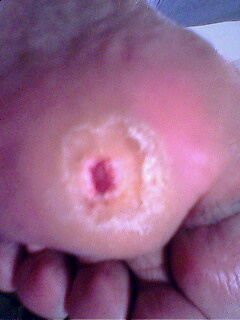 下面是治疗五天后的图片.各位同仁对此病有何好的治疗方案.请多多指教.