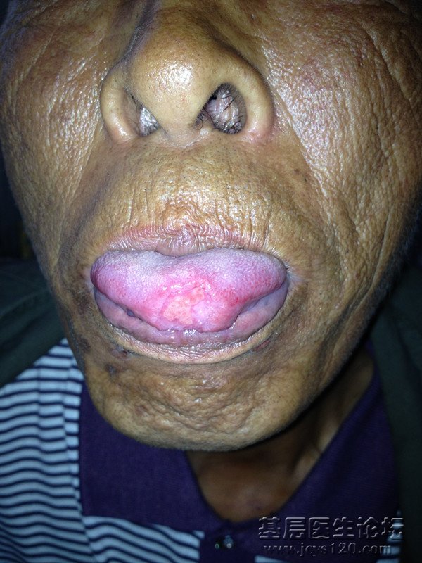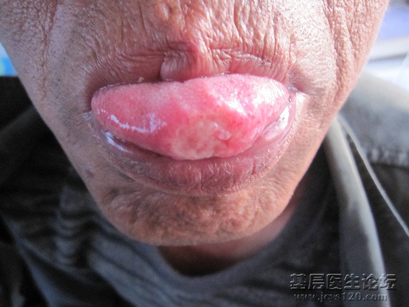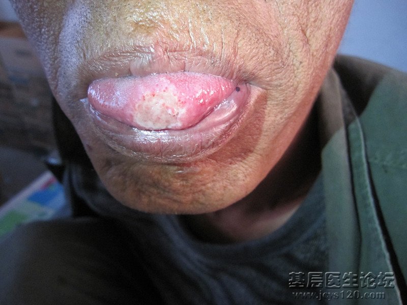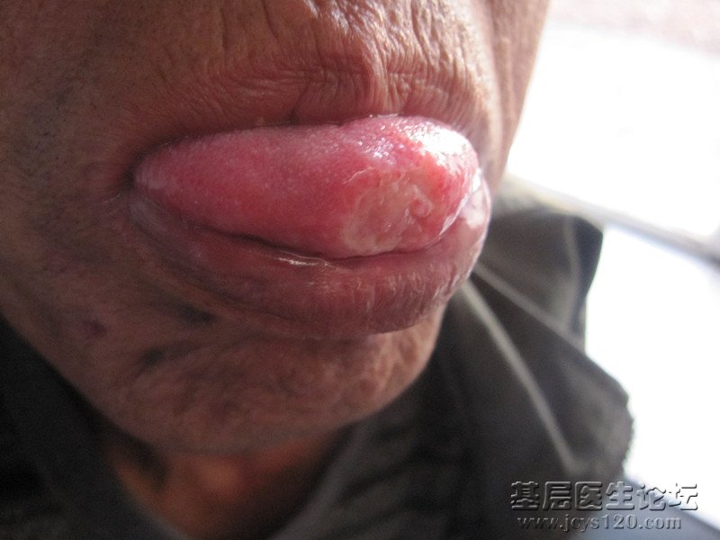 第一印象是口腔炎(舌炎);首先考虑霉菌感染(菌群失调症),治疗以提高机体免疫力大量补充vb2,锌制剂为主,局部涂抹制霉素片,淡盐水漱口等等。该病例一般治疗效果不理想(我这有一个类似病例)。