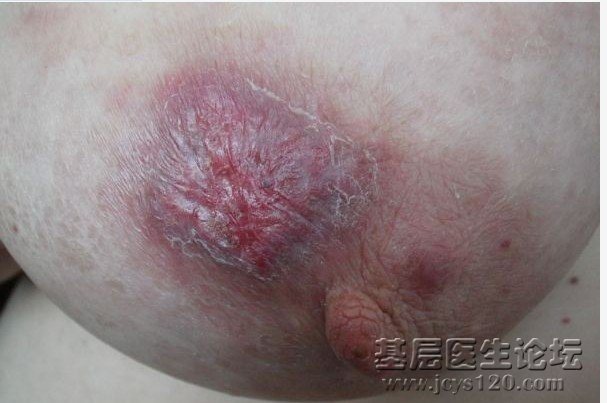 情况:右乳房浸润性红斑,中间少许溢脓、结痂,边缘一蚕豆大结节。