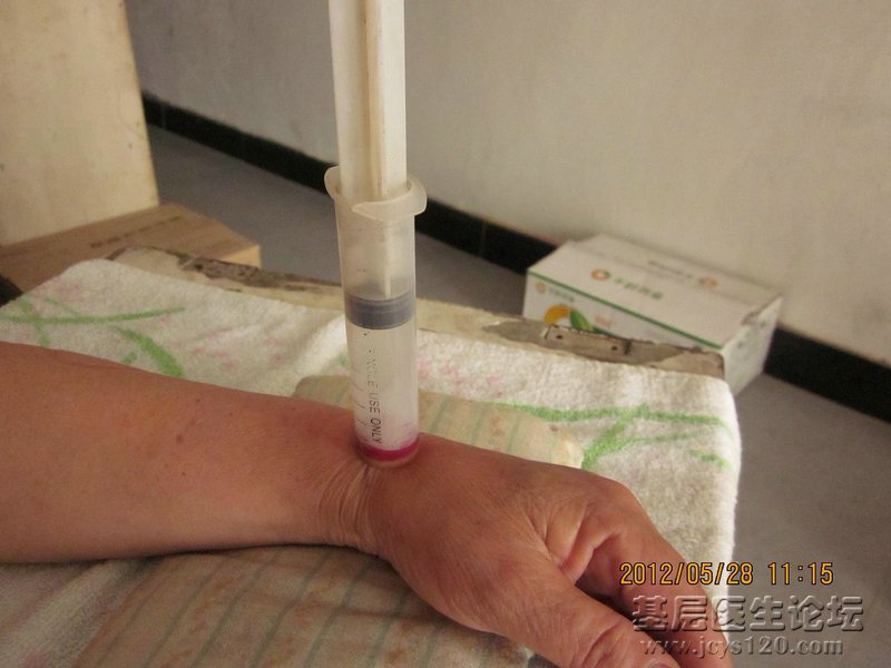 现在流行针灸、流行感冒,却不流行针灸治感冒!要知道《针灸治疗学》的第一篇就是感冒,这不愧是我们针灸界的第一大悲哀!为了推行针灸在基层中的运用,也想为本针灸版块的繁荣出点薄力,特将本人临床针灸治感冒的一个简便有效的方法分享出来,欢迎大家批评指正! 【取穴】: 阳溪穴(为手阳明大肠经的经穴,五行属火) 【针法】: 用锋针(九针之一,即三棱针)在阳溪穴上刺络拔罐,泻血1~2ml左右。 【原理】: 手阳明经上行头面部而交足阳明。《难经·六十八难》云:“经主喘咳寒热”。阳溪为五腧穴中的经穴,善治寒热病证、头痛、鼻部疾患、咽喉肿痛、咳嗽等。《灵枢·九针论第七十八》云:“阳明多血多气”,在阳溪穴上刺血可驱外感之风寒风热。 【注意事项】:虚人感冒不宜;此法适用于初期感冒,多数人一次好转;感冒重证在辩证使用解表汤剂或输消炎抗病毒的针剂的同时,可配合此法加强效果。附图如下: