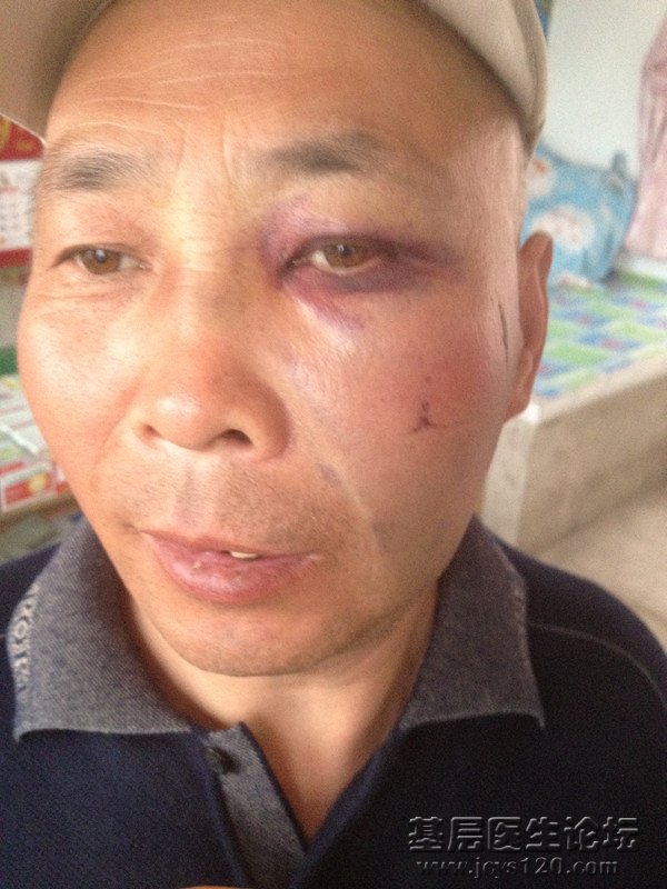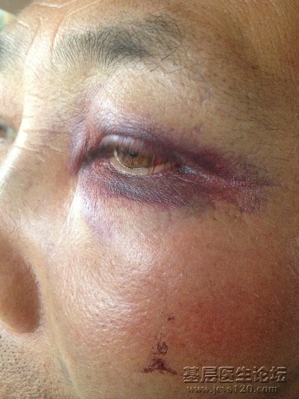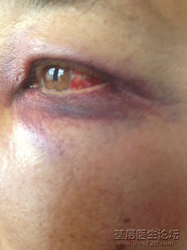 非常赞同9楼重楼版主的观点。补充几点见解: 1.患者除了有眼周紫红外,左颊部有一处结痂(皮损较轻),球结膜下出血部位在外眦部位,说明损伤的主要着力点应该在面部的左上外方,这就足以造成球结膜下的血管损伤,如果患者在眼、面部不适的情况下有揉、压的动作,或咳嗽、大便用力等都可致使脆弱的球结膜下毛细血管破裂出血。 2.口服三七片的功效应该没有那么迅速导致出血的神效吧。但为避免口舌,满三天后再用也可。 3.检查眼球表面是否有异物非常必要的;左颊部痂下两三天内局部肿胀足以造成左鼻唇沟变浅,当然查一下面神经也很有道理。 4.有的出血3天内可有增加趋势,故建议三天内宜用冷敷,三天后再酌情局部热敷。 5.出血的消退时间大约需两周以上。 6. 目前可以采取抗炎、止血药物治疗,三天后用活血化瘀类药物。滴眼药水也是有必要的,要注意嘱咐患者合理用眼,不可以长时间处在电脑、电视前。严禁用手揉眼。