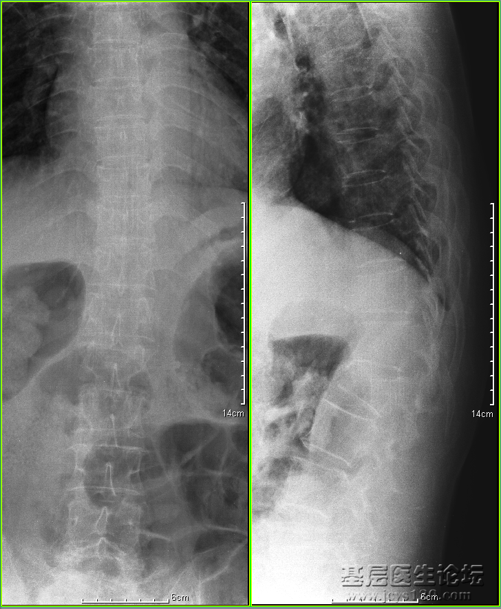 本帖最后由 eve592370698 于 2012-6-18 21:05 编辑 患者女,56岁,摔伤(臀部着地)后腰痛伴腿痛,不能站立。 腰椎正侧位X线摄影(患者配合不佳)可见:   腰椎椎体排列尚可,生理曲度消失,腰1、2椎体呈楔形样变,椎体前缘及腰2椎体上缘不整齐,椎间隙不等宽。腰3、4椎体前缘骨质变尖。余椎体未见明显外伤性改变   印象:1.腰椎1、2压缩性骨折;      2.腰椎骨质增生。