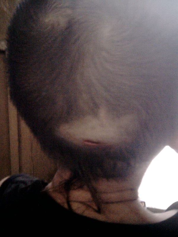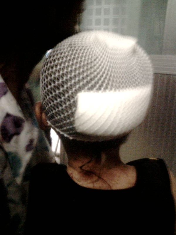 患儿,男,5岁,因在水泥地玩耍,意外后翻跌倒,致头部后脑处着地,当即出血,但无昏迷,无恶心及呕吐。家属由于慌乱,当时未能压迫出血点,导致出血量较多,流到后脑部.颈部及上身处都是。来诊后,经仔细检查,发现出血点为后脑中部偏右处后,给予无菌纱布压迫10分钟后止血。备皮后,发现创口约1cmx1mm,深达皮下,局部血肿约3cmx3cm,由于家属拒绝缝合,只能给予清创包扎,消炎.破抗处理。嘱:出现呕吐,必须急诊!
