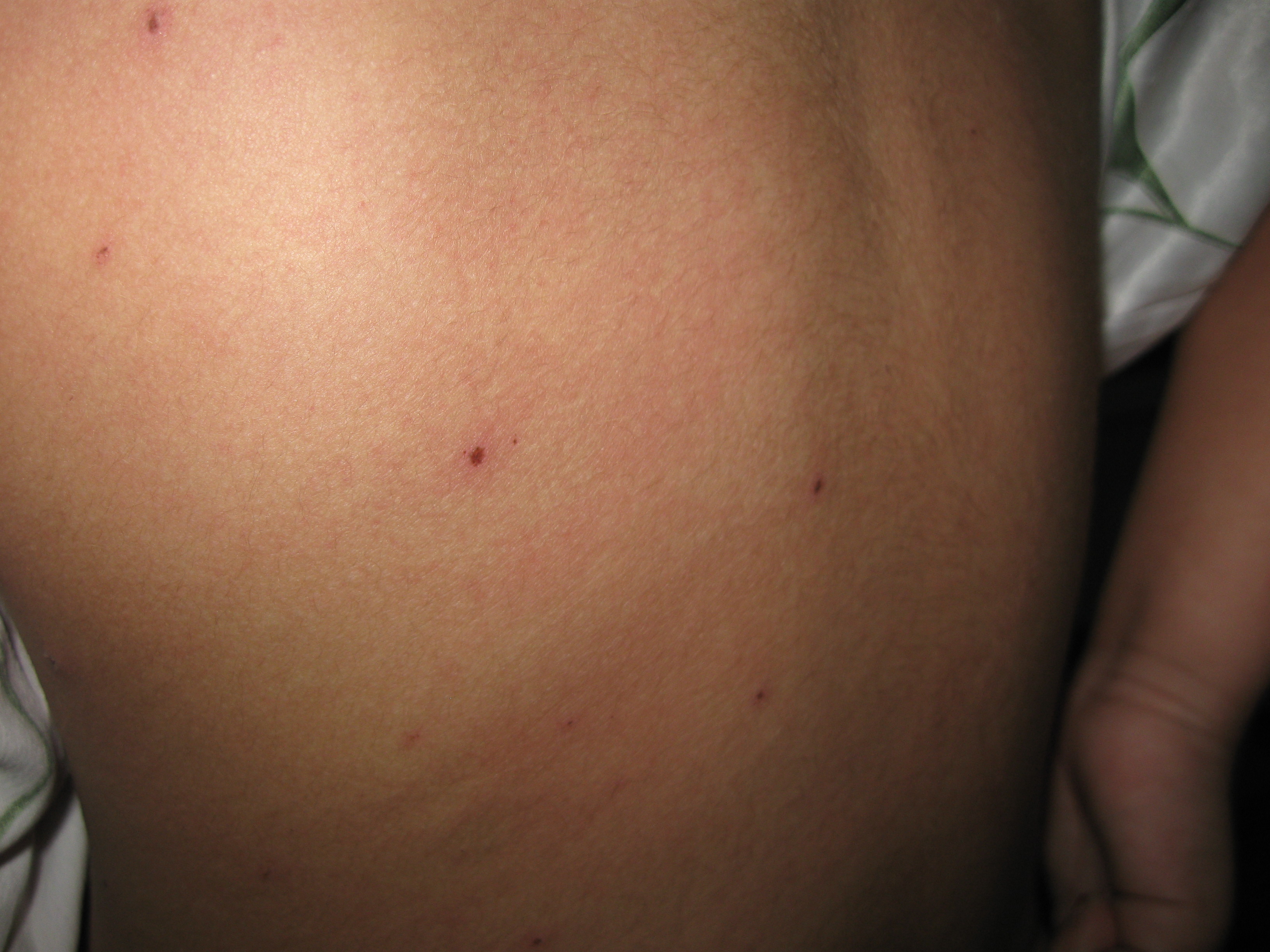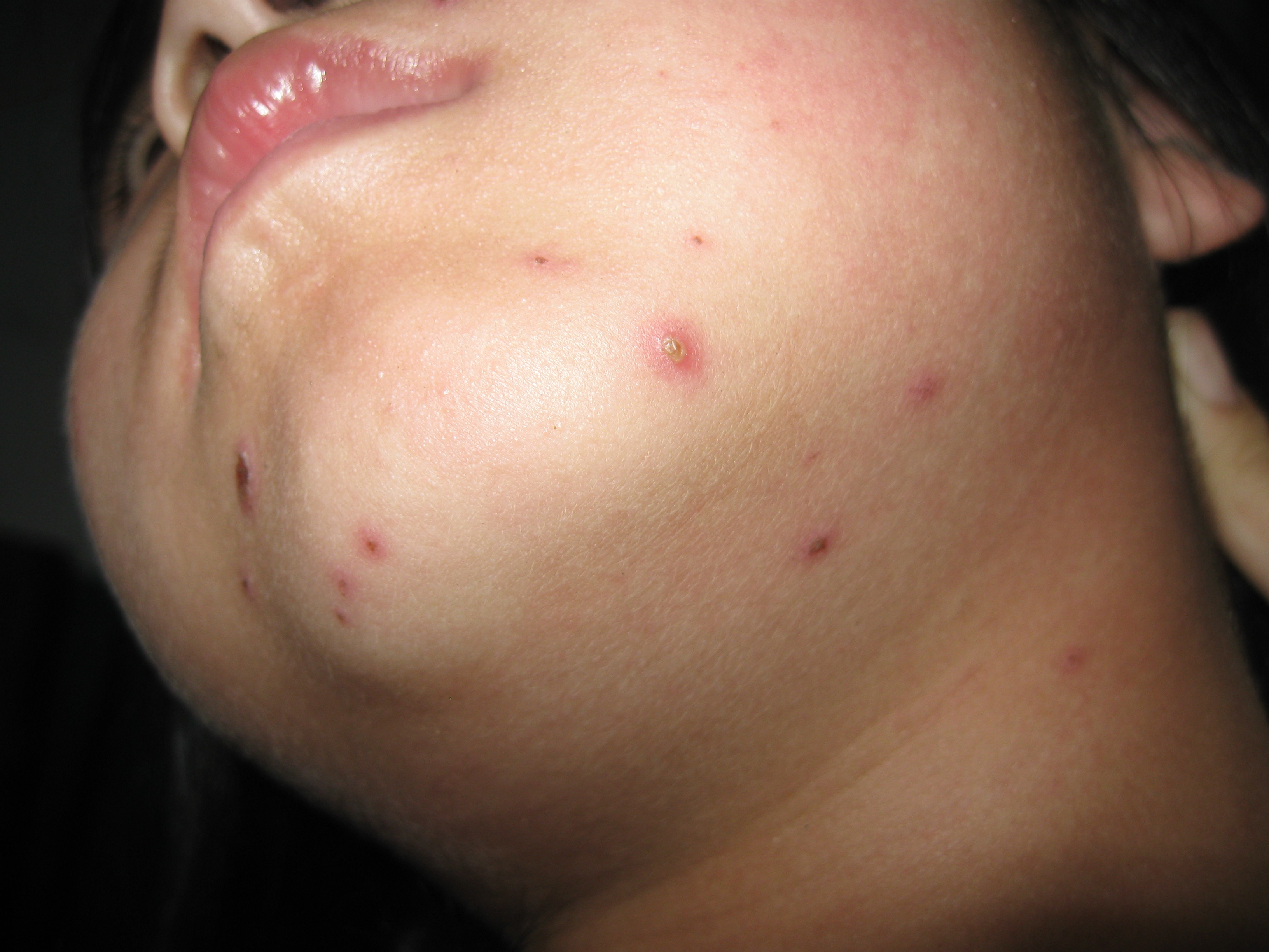 四岁女孩,8.11初诊,颈,背,腹部,头皮上相继出现水泡。伴随发热症状。诊断为水痘,给予常规的抗病毒治疗两天后,(没有用激素和抗生素)仍发热。8.13日现症见:面部轻微浮肿,口角有一小溃疡水泡塌陷,四周红晕明显,体温38.1,疱疹部位瘙痒。加抗生素静滴及口服止痒药物。输液结束后患儿家长给我说患儿外阴部位有疱疹严重,如图:这是下颌部位的背部我认为先出现的现在快好的疱疹