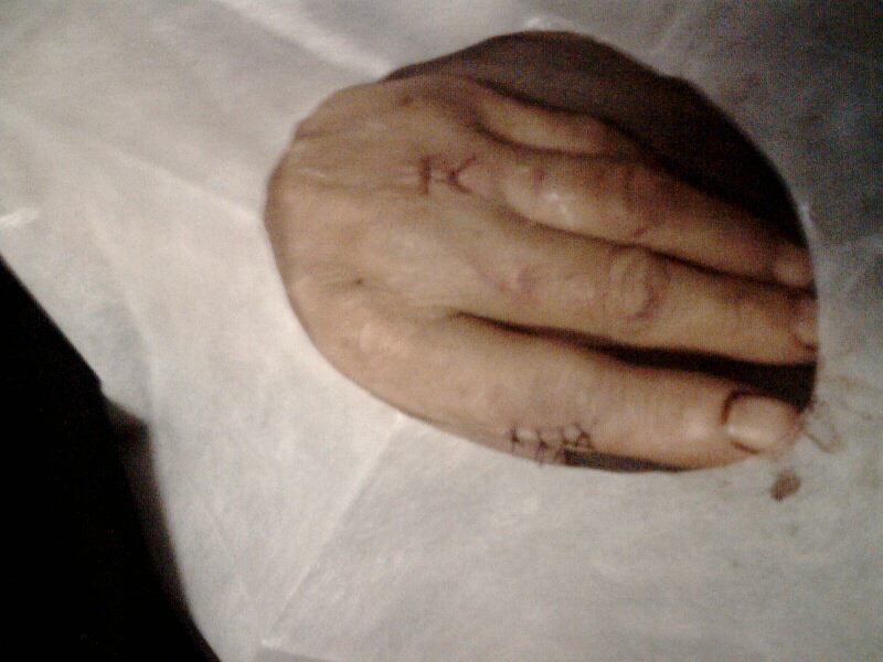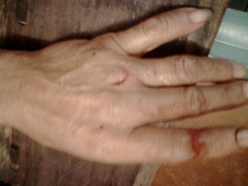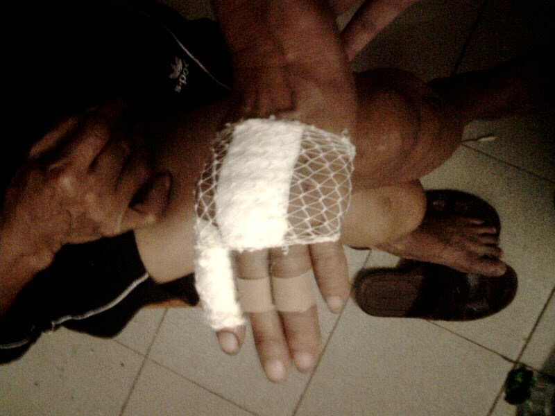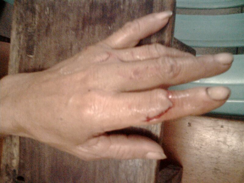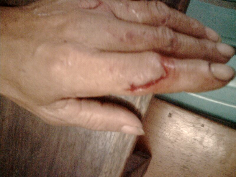 患者,男,52岁,因开摩托不慎,向左边摔倒,致左手掌指皮肤多处擦裂伤,最大处伤口,为食指中部背侧面,约3x1cm,全皮开裂,伤口远端皮肤与皮下组织分离,有活动性出血,经无菌纱布压迫后止血。经过仔细检查,未发现骨折征,作局部麻醉后,行清创.缝合,包扎.消炎.破抗处里。