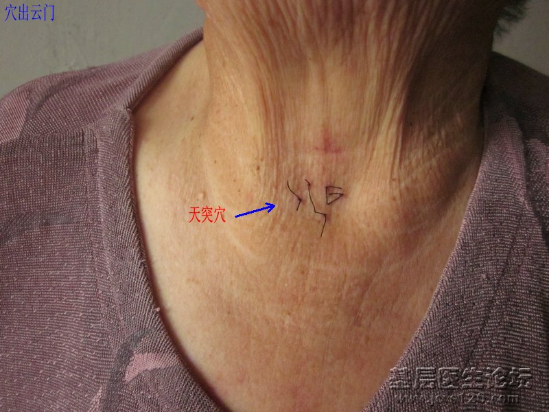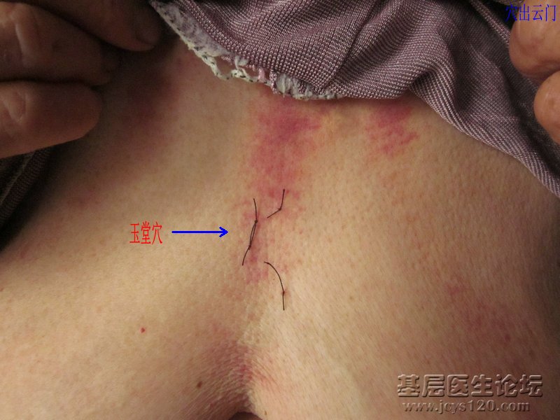 今早一老妪以上吐下泻、头晕一天就诊,细查病人身上有许多线结,追问之下才明白是民间的挑刺疗法,昨天病发后自己刮过痧,未见成效,故请附近一擅长挑刺疗法的村民治疗,据称需线结处烂掉脱落方愈,家人担忧遂来我处治疗。为让大家分享故摄下图片,图中天突穴处名锁喉疔。