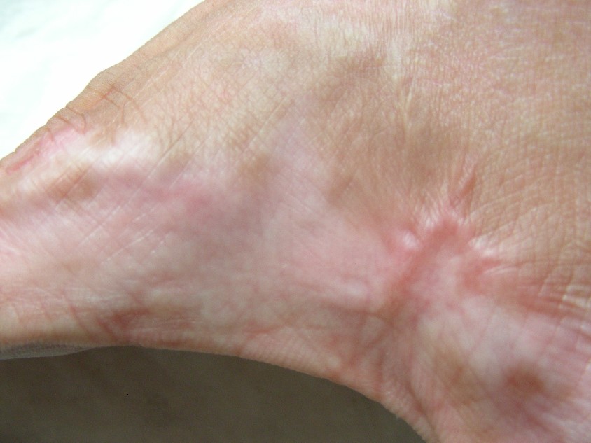 我在去年十月末,在工作中手背被电弧烧伤,用磺胺嘧啶银治疗后,一只擦涂防止疤痕生长的《复方肝素钠尿囊凝胶(康瑞保)》,带弹力手套,到现在手背部出现白斑,不知道会不会扩散,需要怎么治疗