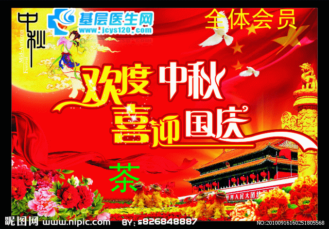 [/color]为了感谢各位会员对网站的大力支持,我们特举办基层医生网庆中秋迎国庆茶话大联欢,活动至发布之日起开始,诚邀各位积极参加,活动以联欢为主,大家可以积极发言,发表对网站有建设性的意见和建议,也可以把你们的才艺拿来展示,琴棋书画,对联谜语,帖子笑话,不拘一格,都可参展,对于好的建议和好的才艺,我们都给加分,以此来感谢大家的积极支持,在此基层医生网也预祝大家,中秋快乐,合家团圆,万事如意,一帆风顺!!! {:6_305:} {:6_305:} {:6_305:} {:6_305:} {:6_305:} {:6_305:} {:6_305:} {:6_305:} {:6_305:}