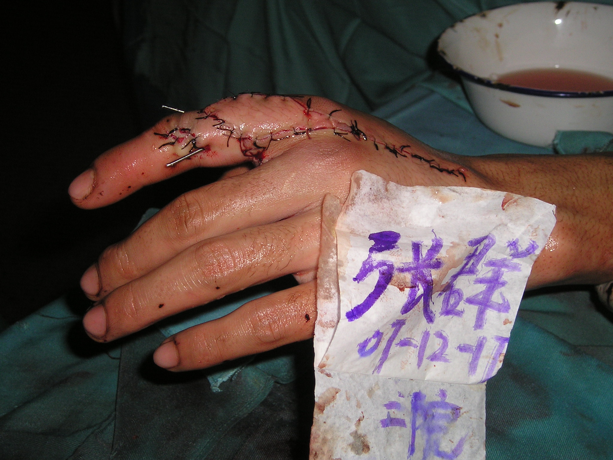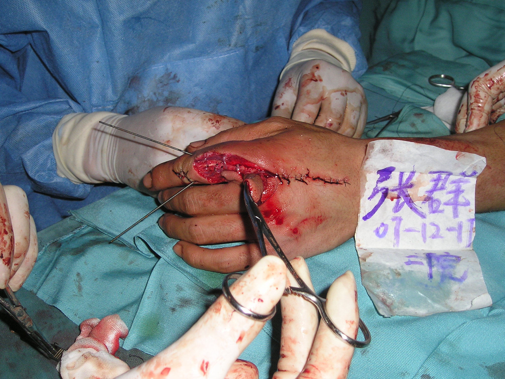 1、如指骨骨折,在彻底的清创后,可用5ml注射器针头行经皮骨折交叉固定,术后暴露端回折,以免经针孔引起感染,并予抗感染治疗。此术需要一定的专业技术,如未行X线且无法确定骨折的性质时,转诊为宜! 2、肌腱损伤、断裂,3.0肌腱缝合线缝合。