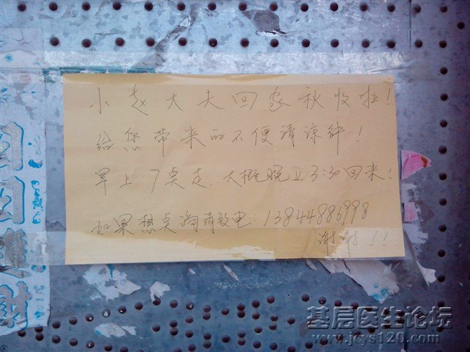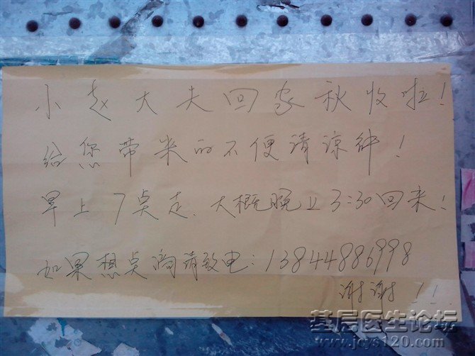 小赵大夫回家秋收啦!给您带来的不便请谅解.早七点走.大概晚上3:30回来.如需点滴,请致电:13844886998.谢谢!