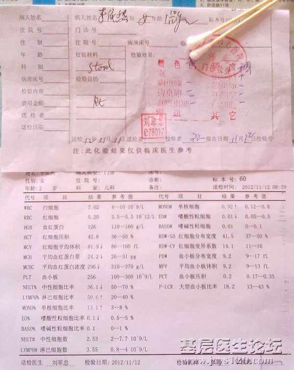 本帖最后由 真人无奈 于 2012-11-14 11:45 编辑 根据楼主的病史报告和化验结果,该患儿是轻度营养性小细胞低色素性贫血合并病毒性肠炎。楼主的治疗非常到位,特别是小儿肠炎伴轻度脱水应用ORS口服补液非常适合基层应用。小儿贫血和小儿肠炎属于儿科四大病。这类患者在儿科门诊多见,治疗方法多种多样。尽管缺乏中医四诊资料,我还想谈谈中医的治法。此类患儿一般属于脾虚湿盛,采用健脾燥湿佐以消导效果也比较满意,采用四君子汤合葛根芩连汤加味主之。特别是伴有发热者更为适宜。方药:小红参3g炒白术3g茯苓3g砂仁3g黄莲3g黄芩3g葛根5g焦三仙各5g甘草3g水煎取液约100毫升左右,多顿少量频服。中医治疗和西医治疗方法有别。西医常采用思密达,鞣酸蛋白等收敛止泻,中医采用健脾清热燥湿佐以消导,通因通治。(轻度脱水者配合ORS口服补液)。尽快排出肠道毒素,减轻中毒症状。可以缩短病程。在此跟帖希望对爱好中医的朋友有所裨益。另外,小儿肠炎治愈后应积极治疗贫血增加患者的抵抗力,关于后者在此不再讨论。