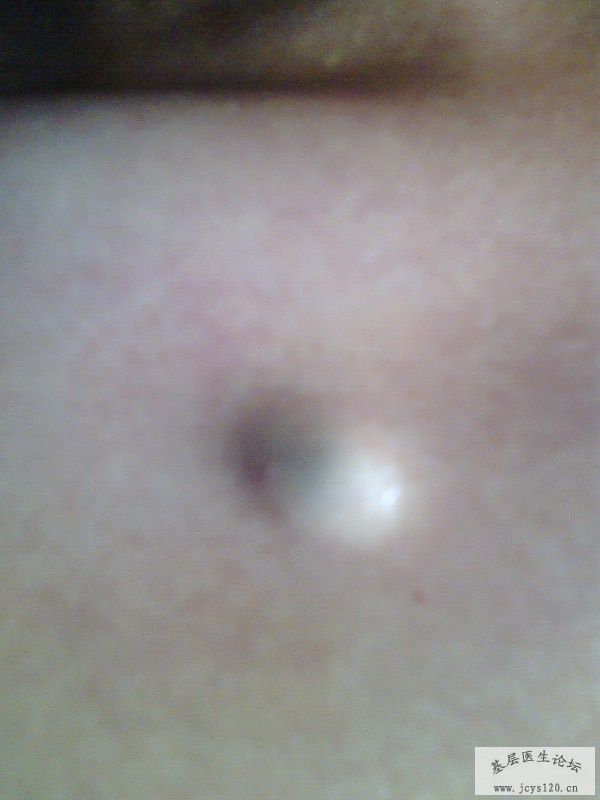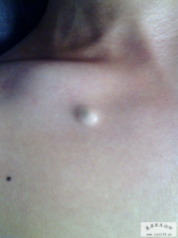 男,22岁,因右侧胸部皮肤小肿物3年来诊。查,右侧胸部锁骨中点下3cm处,可见一约1x1cm的肿物,呈半球状高出皮肤表面,无红.热.痛,中央处皮肤呈淡蓝色,触及质稍硬,表面光滑,无波动感,推动时与皮肤表面粘连,中央处呈现小凹陷,基底部无粘连,可活动,挤压时无痛感,未见豆腐渣样物排出。
