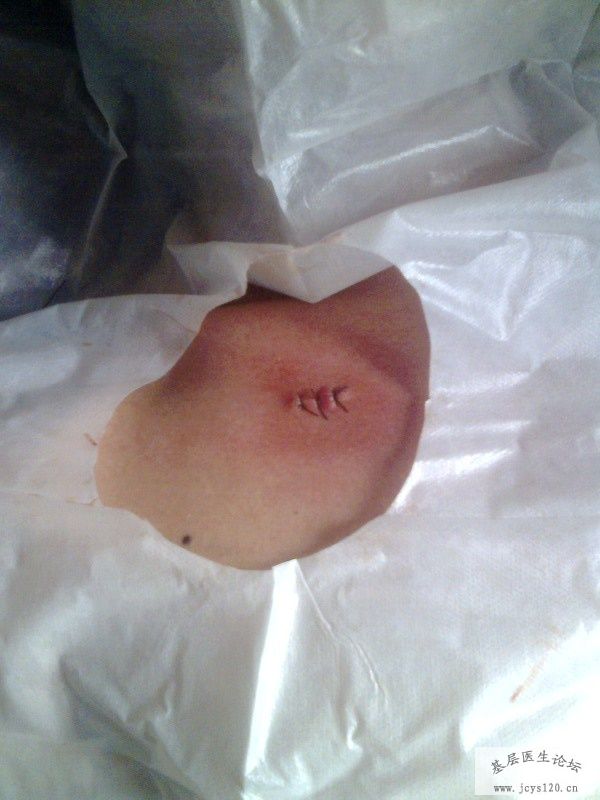 4.用血管钳沿皮肤切口钝性四周分离(尽量完全裸露肿物)