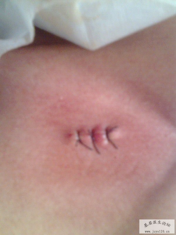 3.在与囊肿粘连的皮肤部位及其导管开口处作一梭形切口(小心不要切破囊壁)
