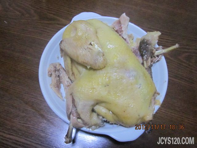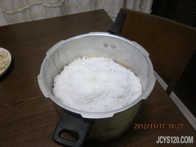 盐焗鸡 把杀好的鸡水滤干,内脏取出,鸡内部用盐涂抹一遍,放入适量香菇,生姜片,葱头。用细小的线把鸡捆紧来,再用卫生纸包裹一遍,卫生纸可以用锡箔纸或者干荷叶代替。 在高压锅底先铺上一公分左右的盐,这个盐最好是粗盐,海盐也可以。如果没有,也可以用我们常用的细盐代替。再把处理好的鸡放入锅中,再放入盐,这个盐一定要把鸡全部掩盖住哦! 文火焖3个小时便可以吃啦!