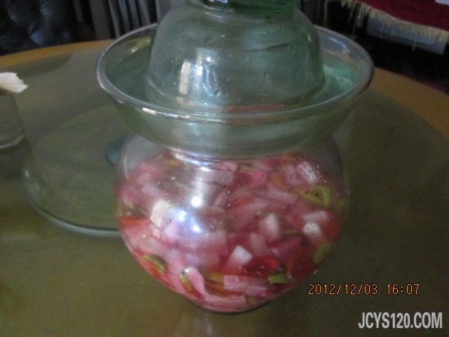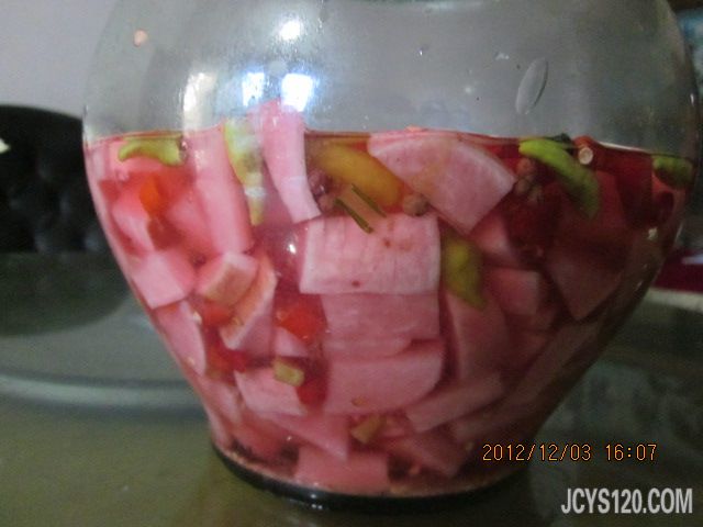 开胃萝卜 萝卜最好是红皮的,切成小块,加入适量冰糖,白醋,盐,辣椒。多少跟个人口味有关。一般腌制一个晚上就可以吃了,注意啦!如果没有坛子,也可以用碗,腌制好后不要把生水和油放进去了哦!每次取用最好用专用筷子。