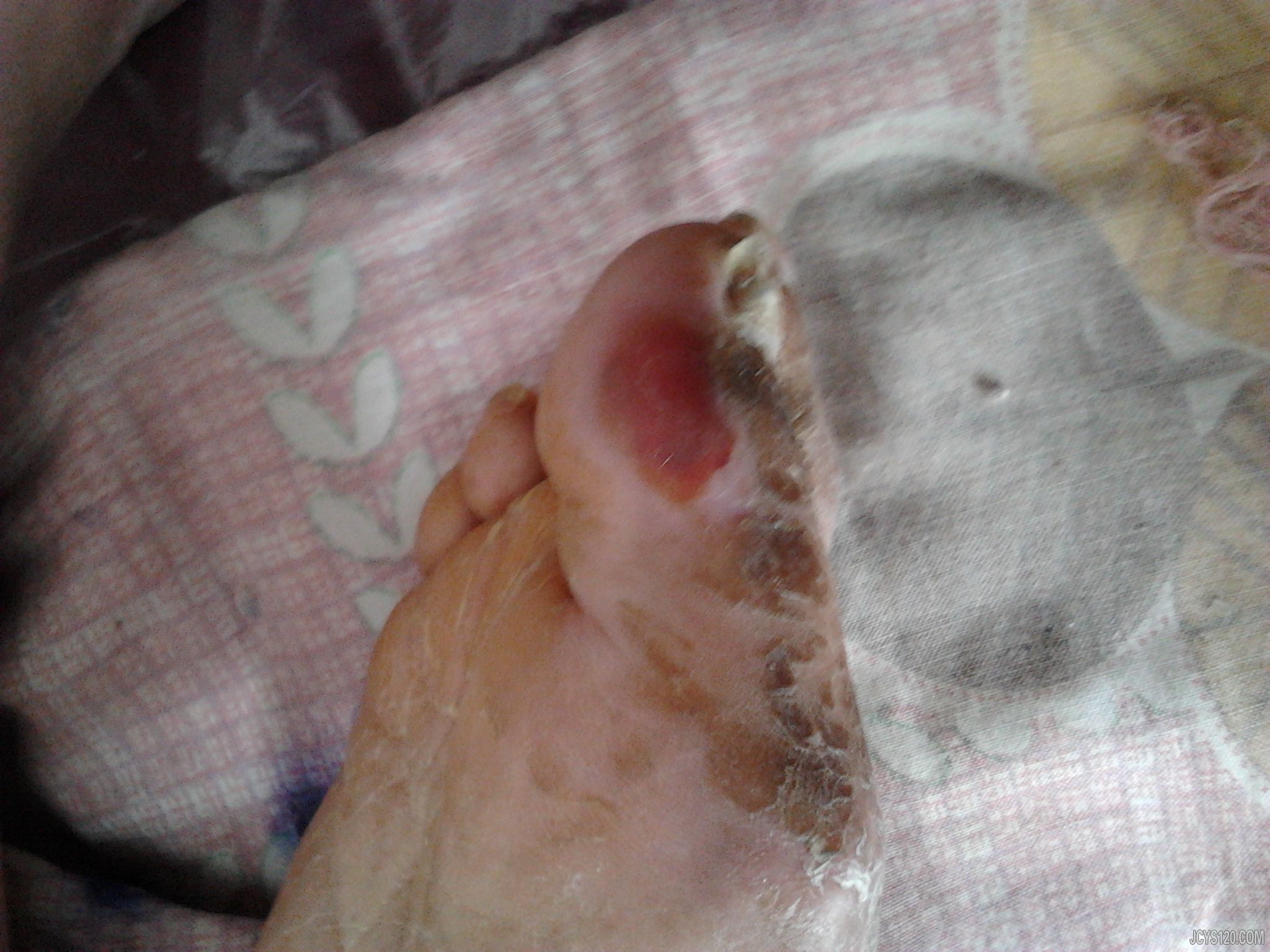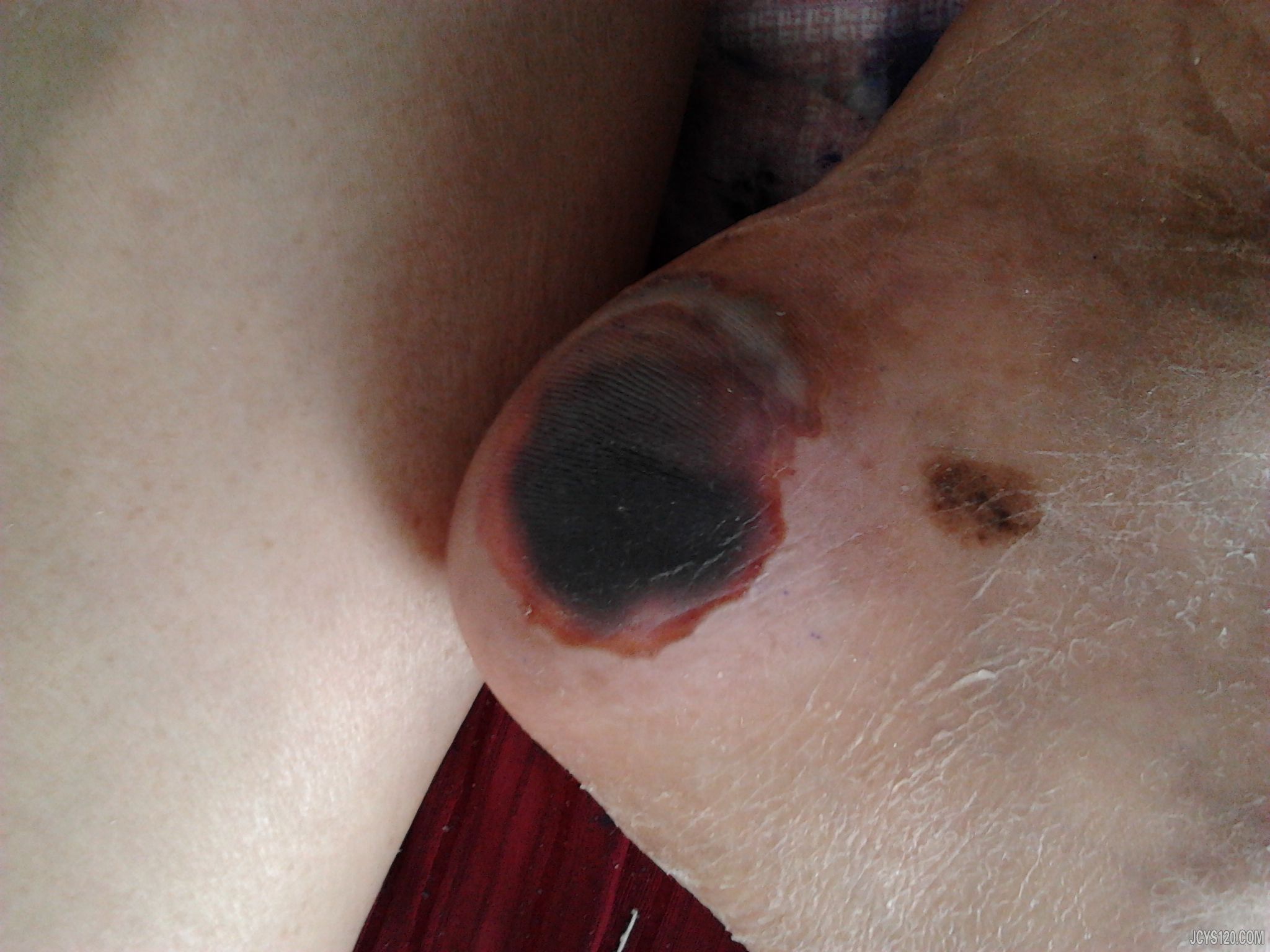 此患者 女 64岁 脑出血后瘫痪在床4年有余 无语言表达能力 哭笑反复无常 无糖尿病史 其子女来我处诉“不知道怎么回事 我妈的脚后跟处又黑又紫”随患者到其家里,看到次患处 问其子女多长时间了 说是能有一个多礼拜了 但我感觉发展到这程度得挺长时间了 . 次日早 去给其患者测量血糖 空腹血糖5.4 问其子女脚跟部是否长时间压着未动 患者家属否认 说也经常翻身 按摩 但本人感觉有可能其家属往往忽视了小地方 不知如何处理是好 请教各位,急!!!