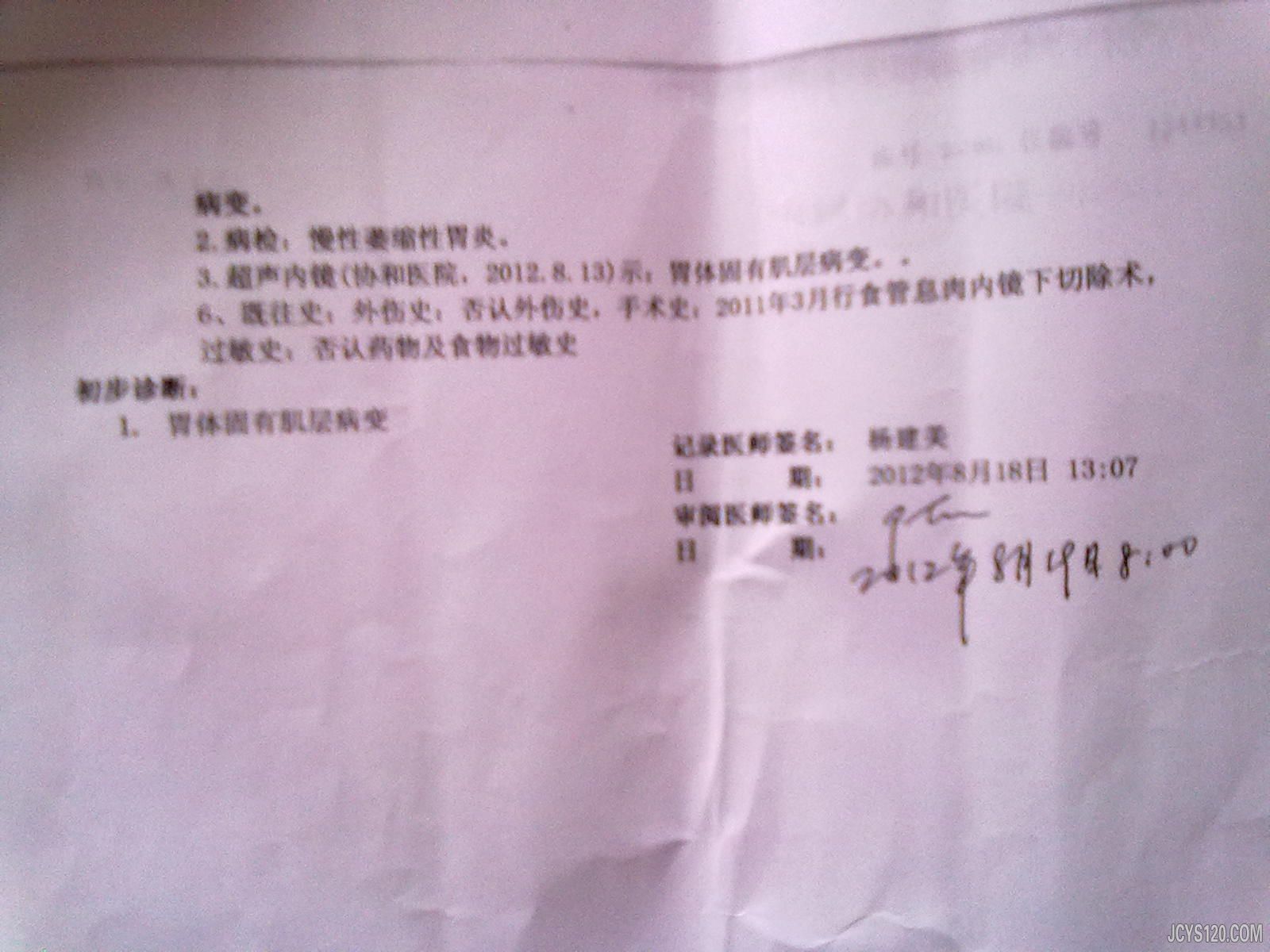 我刚想发的病历和这个一样,被你抢先了,文中的糜乱应为糜烂。 诊断: 1 糜烂性胃炎 2 食道癌待查 治疗 1 NS 100 ML +奥美拉唑40MG 点滴 2 NS 100 ML +青霉素480万U 点滴 3 若查出食道癌,考虑手术,化疗,放疗