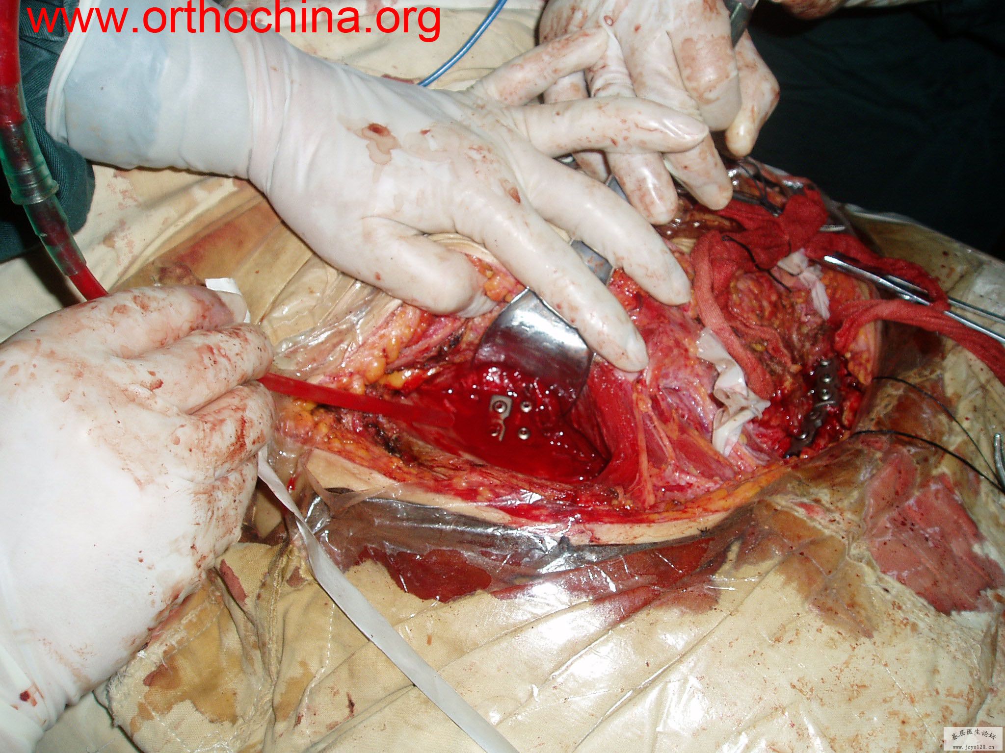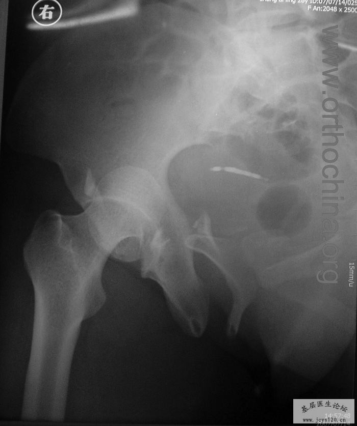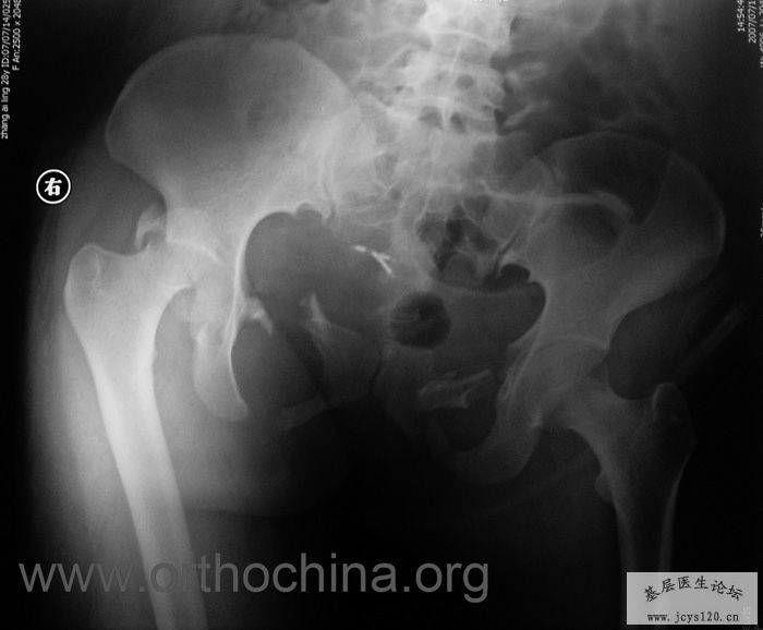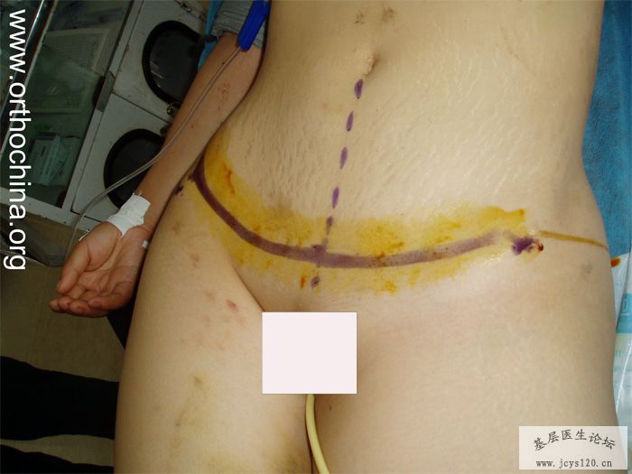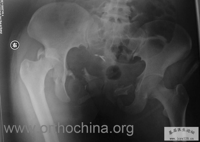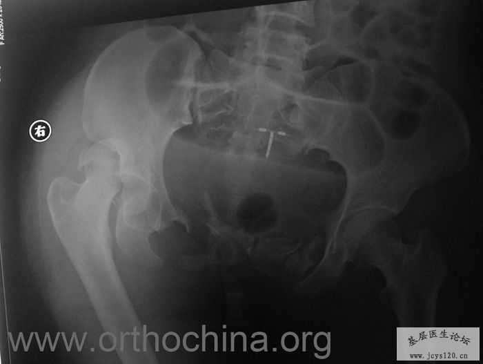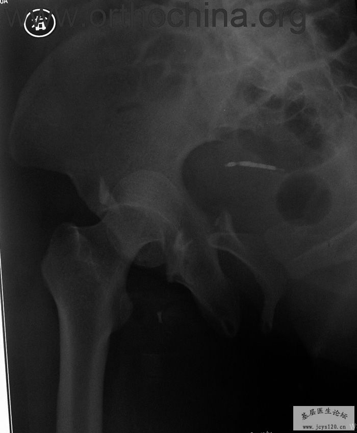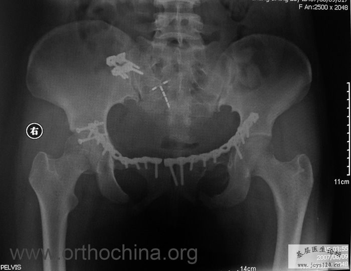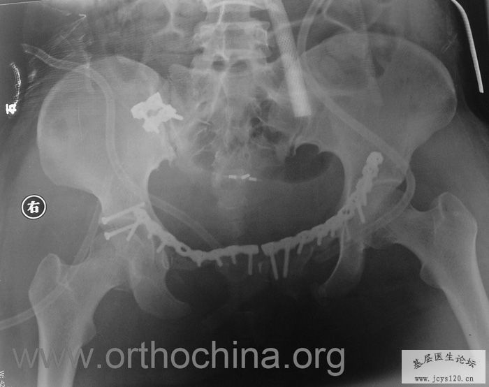 患者,女,28岁,车祸中骨盆轧伤后疼痛功能障碍1小时。查体:休克外貌,烦躁不安。头颈胸腹无异常,脊柱无异常,两下肢血供及感觉正常。骨盆挤压分离试验阳性。阴道、尿道、直肠、腹内脏器无损伤。住院后抗休克、骨牵引及对症治疗1周后,行前后联合入路手术。股骨头骨折复位后用可吸收螺钉固定,骶髂关节、髋臼前后柱、对侧耻骨上下支用骨盆重建钛板固定,术中出血1200ML,手术时间8小时。部分图片如下: