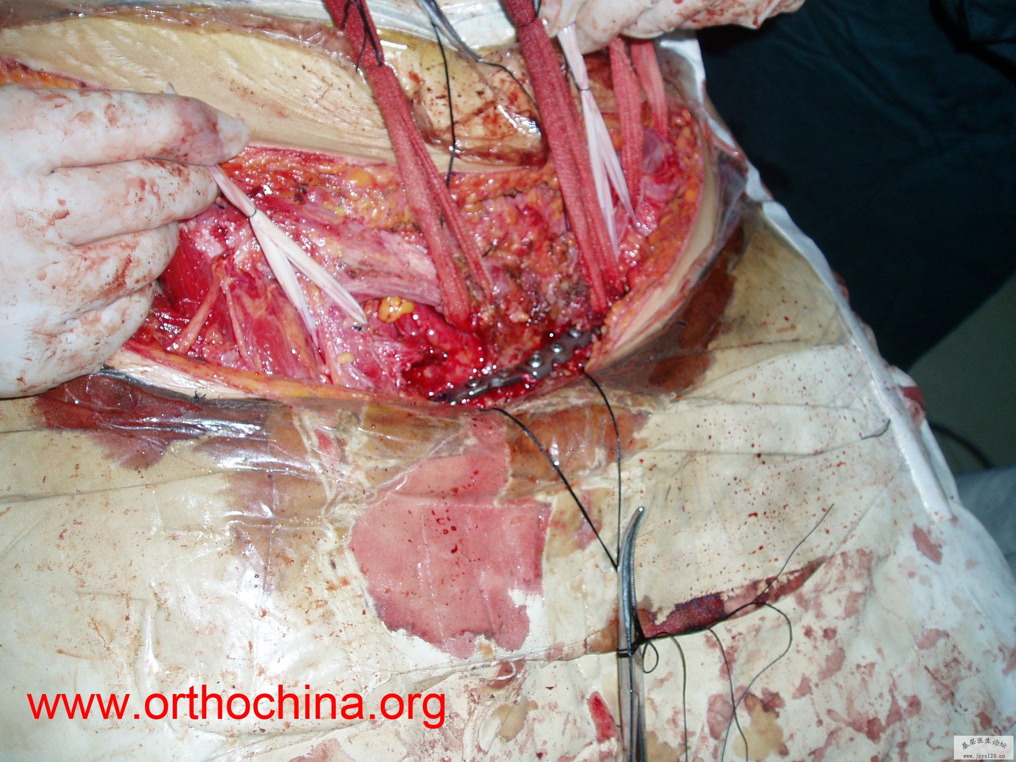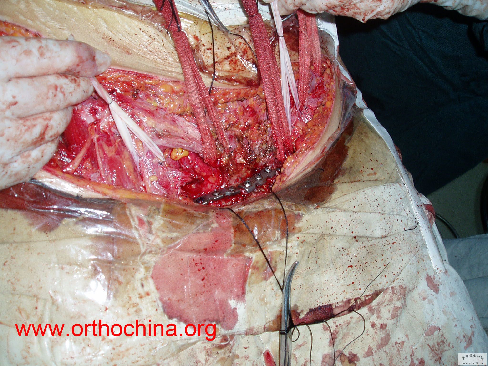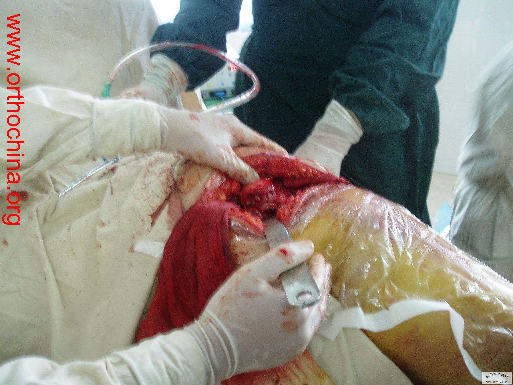 患者,女,28岁,车祸中骨盆轧伤后疼痛功能障碍1小时。查体:休克外貌,烦躁不安。头颈胸腹无异常,脊柱无异常,两下肢血供及感觉正常。骨盆挤压分离试验阳性。阴道、尿道、直肠、腹内脏器无损伤。住院后抗休克、骨牵引及对症治疗1周后,行前后联合入路手术。股骨头骨折复位后用可吸收螺钉固定,骶髂关节、髋臼前后柱、对侧耻骨上下支用骨盆重建钛板固定,术中出血1200ML,手术时间8小时。部分图片如下: