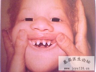[b][size=6]患者,男,9岁。看似5岁儿童,发育迟缓,脱发,牙齿如下图,指甲如下图,严重智力障碍;在夏天高热天气经常出现高热无汗。 大家有兴趣可踊跃发言。