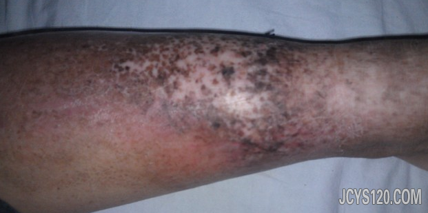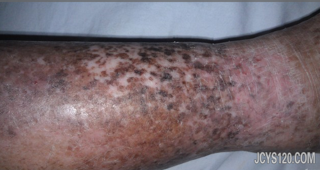 患者女,56岁,渔民。双小腿红肿20余年。患者20多年前在无明显诱因下双小腿出现红斑,伴有少许瘙痒,无渗液及化脓,当时未予特殊处理,后红斑逐渐扩大,蔓延至整个小腿伸侧、内外侧及足背,伴有片状l鳞屑,冬天肿胀加重,并有胀痛感;近两年在当地医院治疗,具体药物不祥,据患者口诉有外用曲安奈德,治疗后足背肿胀消退,小腿部红肿也有消退现象,但是小腿伸侧出现深黑色斑点。患者有糖尿病病史2年,血糖控制欠佳;有颈部脂肪瘤病史,已切除;小腿部无外伤史。体查:双小腿肿胀,伸侧及两侧皮肤发红,边缘不清,伴有少许片状鳞屑和褐色、黑色色素沉着,部分色素脱失,皮肤质硬,压之无凹陷及压痛。生化检查除血糖异常外,未见其他明显异常。组织病理示:皮肤鳞状上皮假上皮瘤样增生,真皮纤维组织增生伴胶原变性。这个病的诊断是什么?考不考虑慢性湿疹,但是病理诊断又不支持湿疹的诊断;要明确诊断需加做什么检查?黑色色素沉着和色素脱失是不是可以考虑外用激素后引起的色素改变?